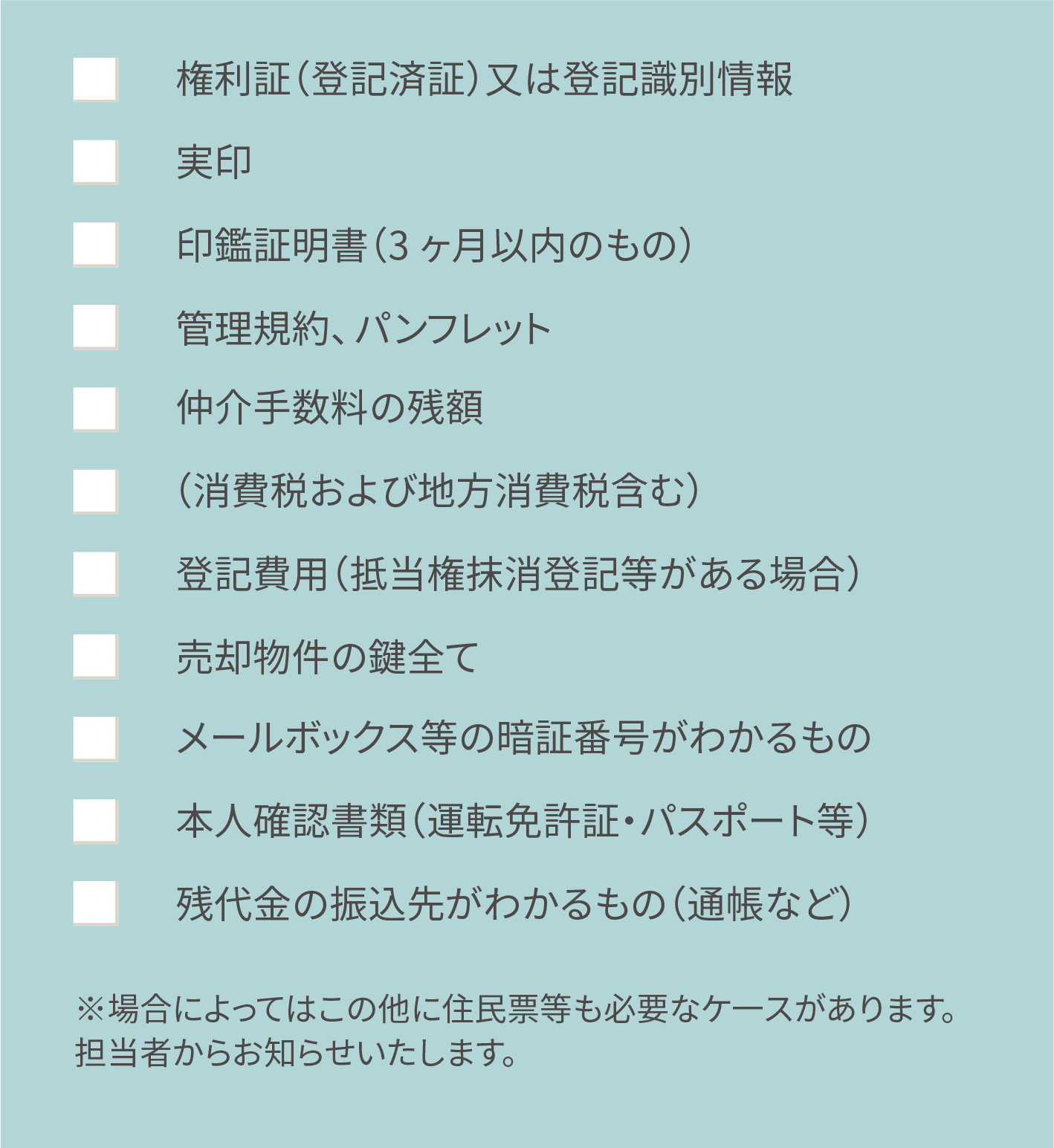 売却物件に住宅ローンの残債がある場合、金融機関の抵当権が設定されていたら、抵当権を抹消する手続きが必要となり、そのためには金融機関との事前手続きが必要となります。手続きには時間がかかりますので、必ず事前に借入先金融機関にお問い合せください。